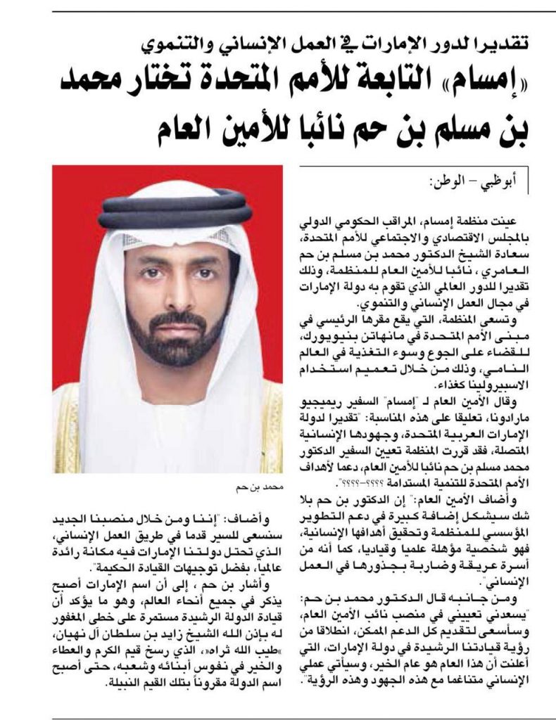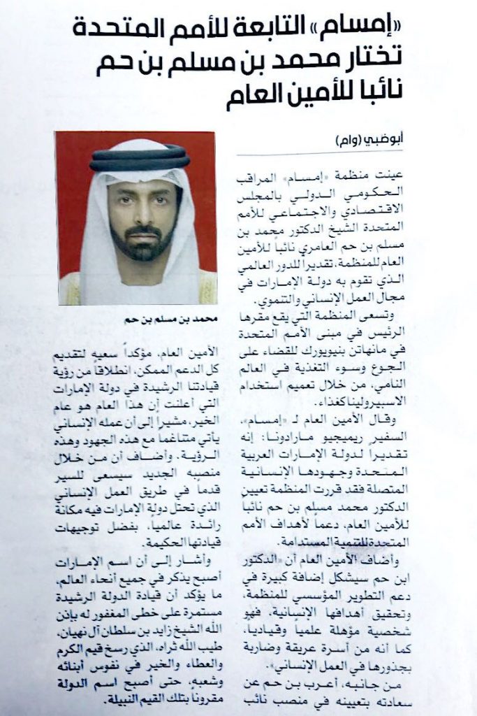 وقال الأمين العام لـ ((إمسام)) السفير ريميجيو مارادونا: إنه تقديرا لدولة الإمارات العربية المتحدة وجهودها الإنسانية المتصلة فقد قررت المنظمة تعيين الدكتور محمد مسلم بن حم نائبا للأمين العام، دعما لأهداف الأمم المتحدة للتنمية المستدامة.