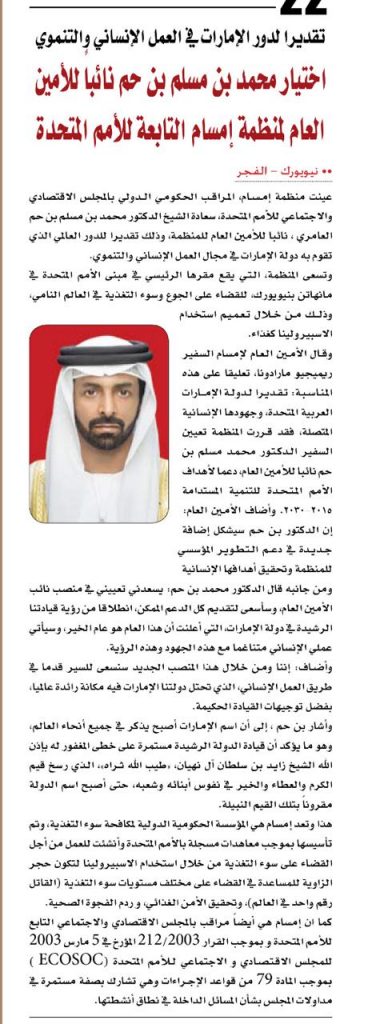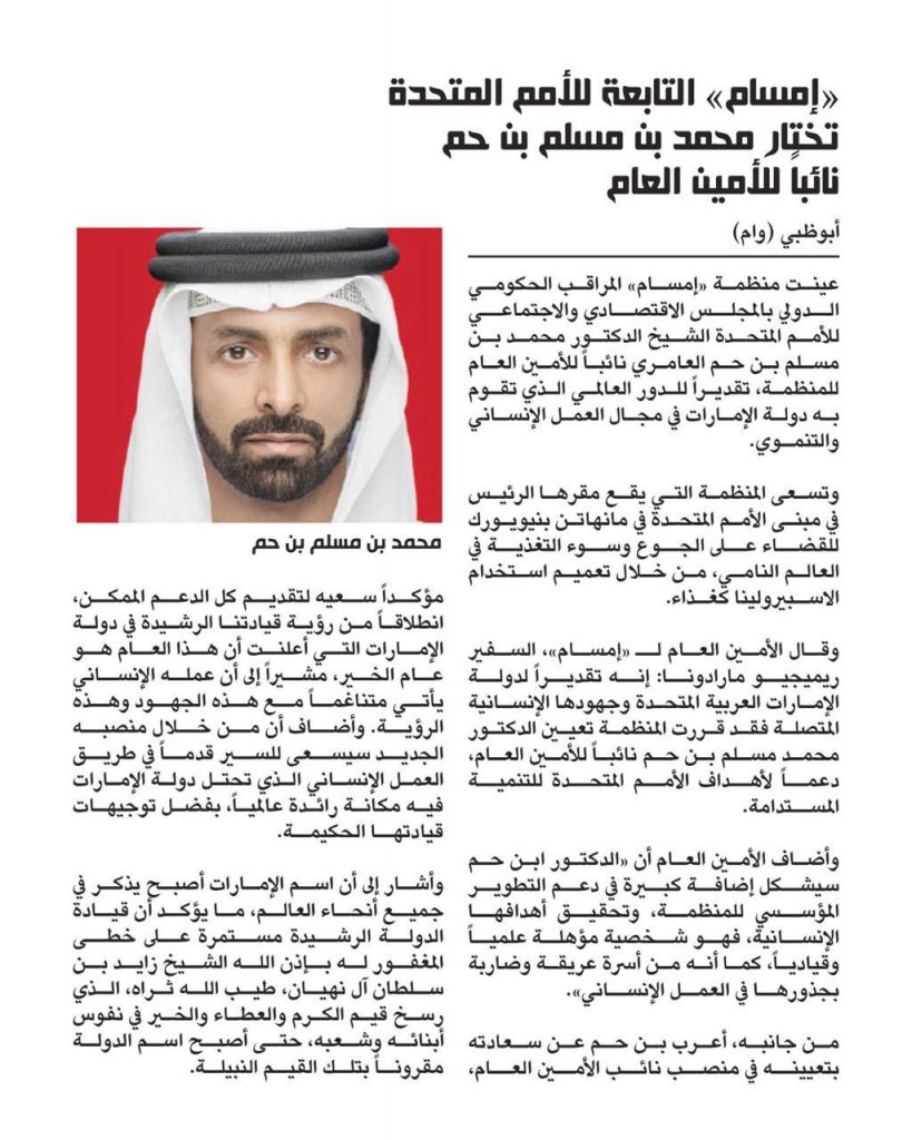 عينت منظمة ((إمسام)) المراقب الحكومي الدولي بالمجلس الاقتصادي والاجتماعي للأمم المتحدة الشيخ الدكتور محمد بن مسلم بن حم العامري نائبا للأمين العام للمنظمة، تقديرا للدور العالمي الذي تقوم به دولة الإمارات في مجال العمل الإنساني والتنموي.