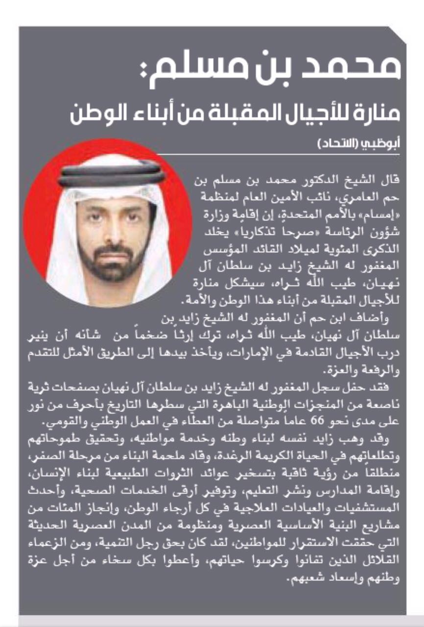 أكد الشيخ الدكتور محمد بن مسلم بن حم العامري نائب الأمين العام لمنظمة إمسام بالأمم المتحدة، تعليقا على إقامة وزارة شؤون الرئاسة صرح تذكاري يخلد الذكرى المئوية لميلاد القائد المؤسس المغفور له بإذن الله الشيخ زايد بن سلطان آل نهيان طيب الله ثراه، بأن هذا الصرح سوف يشكل منارة للأجيال المقبلة من أبناء هذا الوطن والأمة.