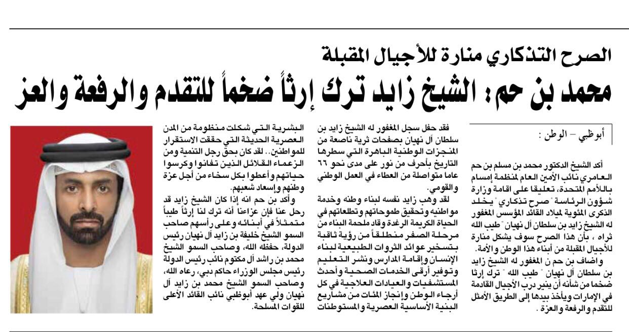 وأضاف بن حم أن المغفور له الشيخ زايد بن سلطان آل نهيان، طيب الله ثراه، ترك إرثاً ضخماً من شأنه أن ينير درب الأجيال القادمة في الإمارات و يأخذ بيدها إلى الطريق الأمثل للتقدم والرفعة والعزة.