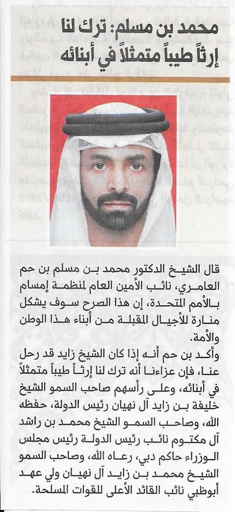 وأكد بن حم انه إذا كان الشيخ زايد قد رحل عنا فإن عزاءنا أنه ترك لنا إرثاً طيباً متمثلاً في أبنائه وعلى رأسهم صاحب السمو الشيخ خليفة بن زايد آل نهيان رئيس الدولة، حفظه الله، وصاحب السمو الشيخ محمد بن راشد آل مكتوم نائب رئيس الدولة رئيس مجلس الوزراء حاكم دبي، رعاه الله، وصاحب السمو الشيخ محمد بن زايد آل نهيان ولي عهد ابوظبي القائد الأعلى للقوات المسلحة.