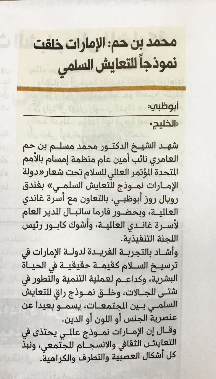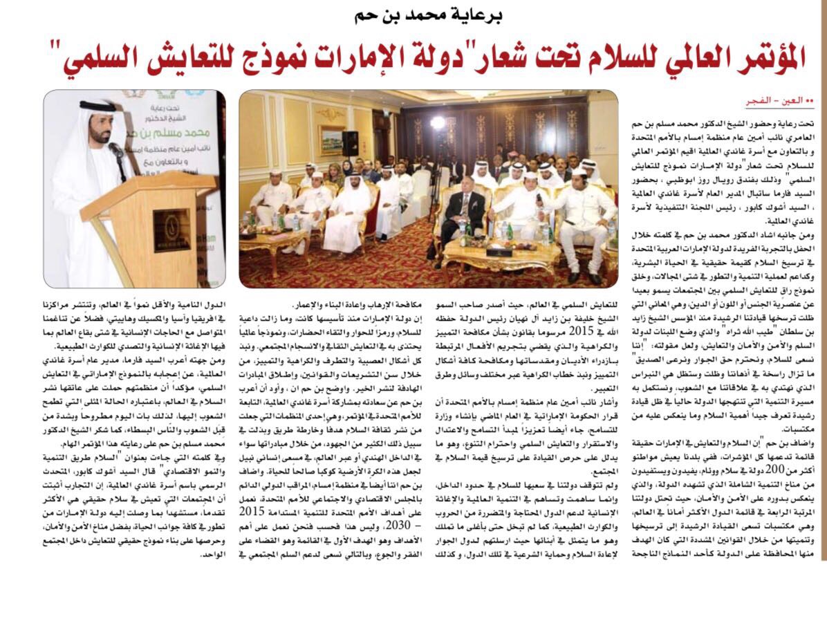تحت رعاية وحضور الشيخ الدكتور محمد مسلم بن حم العامري نائب أمين عام منظمة إمسام بالأمم المتحدة وبالتعاون مع أسرة غاندي العالمية اقيم المؤتمر العالمي للسلام تحت شعار ((دولة الإمارات نموذج للتعايش السلمي)) وذلك بفندق رويال روز أبوظبي، بحضور السيد فارما ساتيال المدير العام لأسرة غاندي العالمية، السيد أشوك كابور، رئيس اللجنة التنفيذية لأسرة غاندي العالمية.