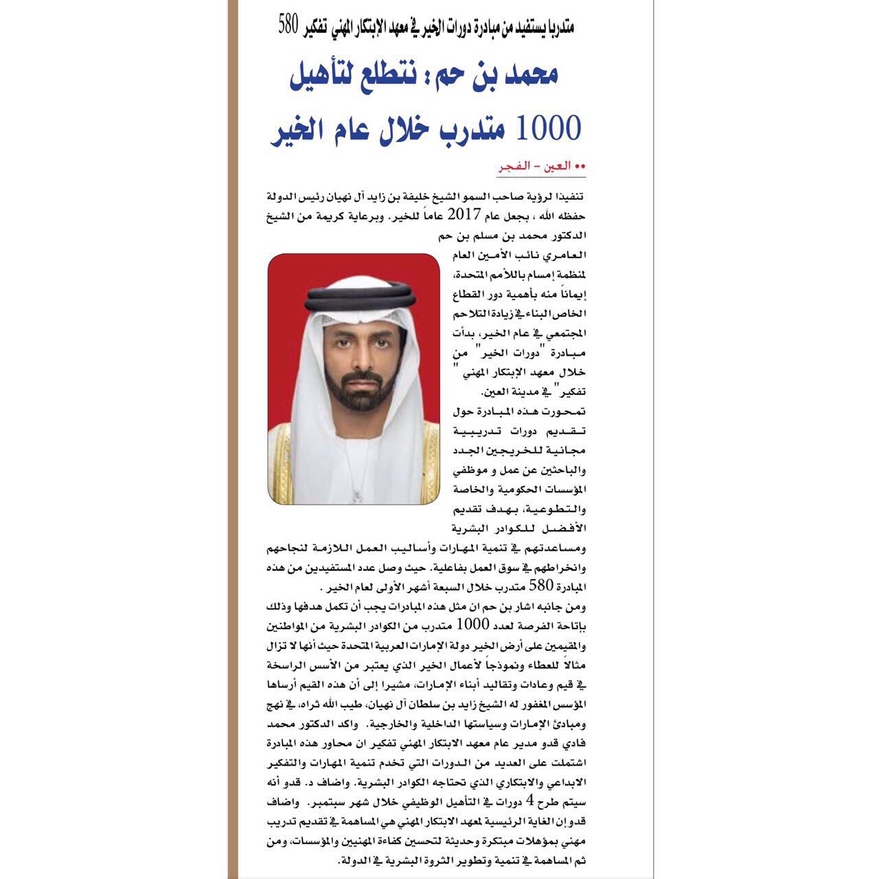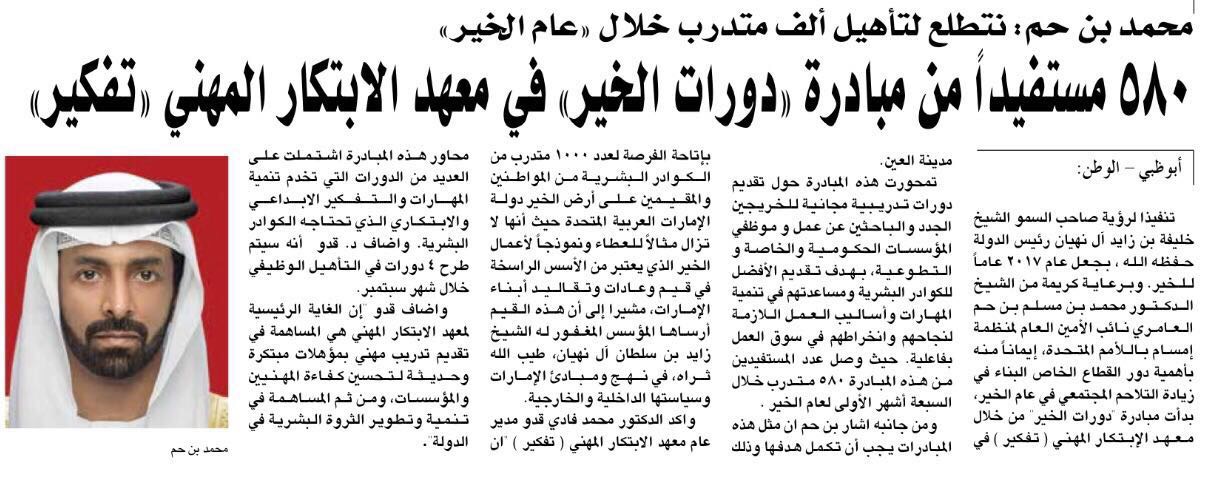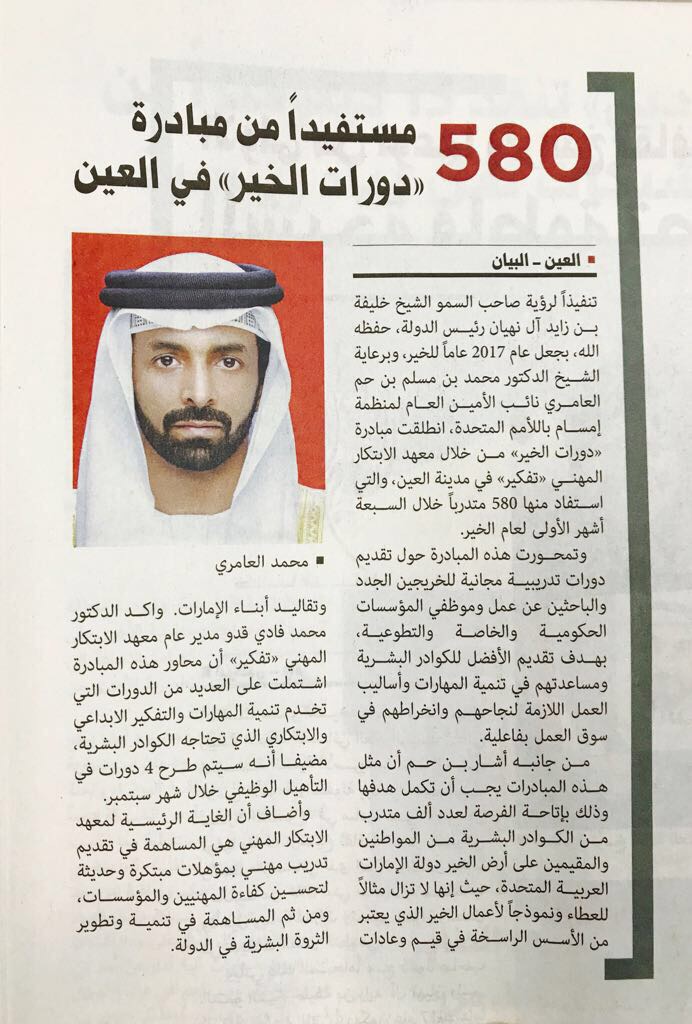 انطلقت مبادرة ((دورات الخير)) من خلال معهد الابتكار المهني ((تفكير)) في مدينة العين، والتي استفاد منها 580 متدربا خلال السبعة أشهر الأولى لعام الخير.